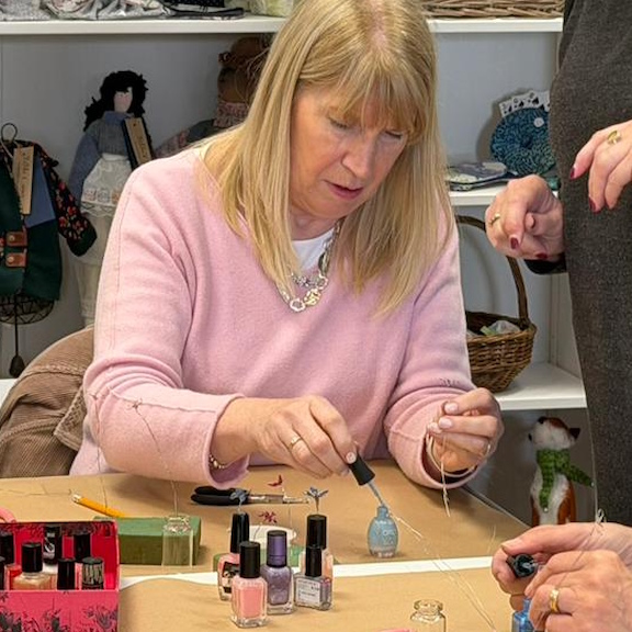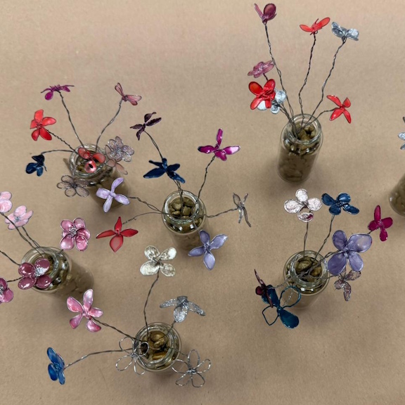 Karen showed the ladies how to bend wire and secure it into the shape of a flower. Once this was achieved each petal was coated in layers of vibrant nail varnish and left to harden.